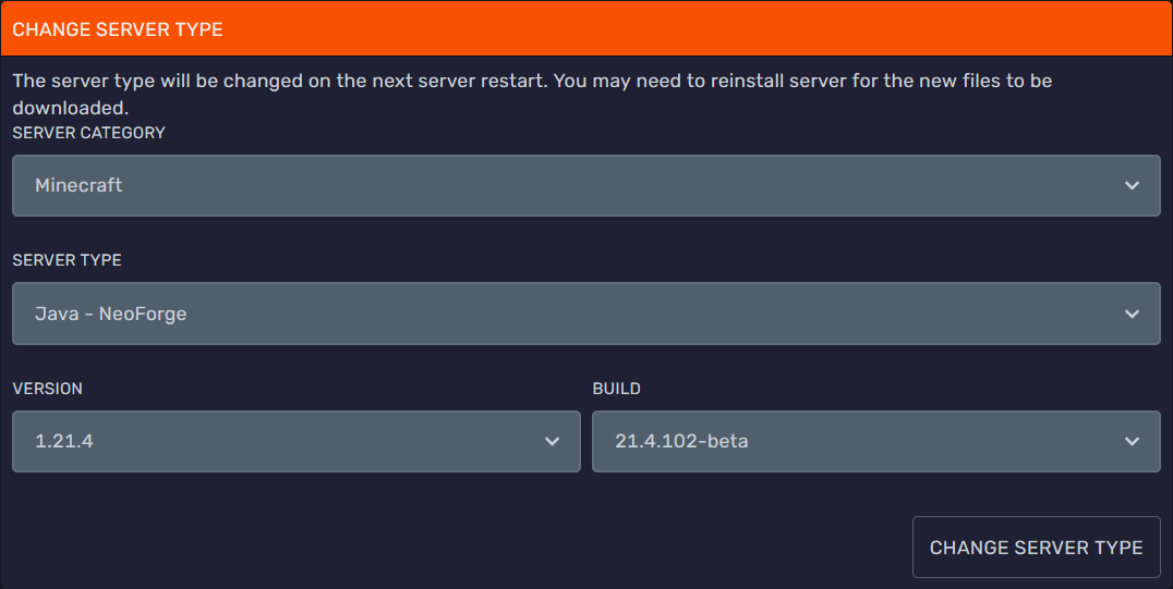 Once the Change Server Type menu has been configured, press the Change Server Type button, this will prompt you to make a backup and it is advised to do so.