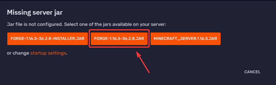 We are almost finished! Now you can go to the console page, and start the server. But don't leave this page! You will be prompted to select the .jar to be used to start the server. You will need to select the Forge .jar, but not the one that says "Installer", just select the one that looks like this: Forge-1.16.5-36.2.8.jar (the version will be different).
